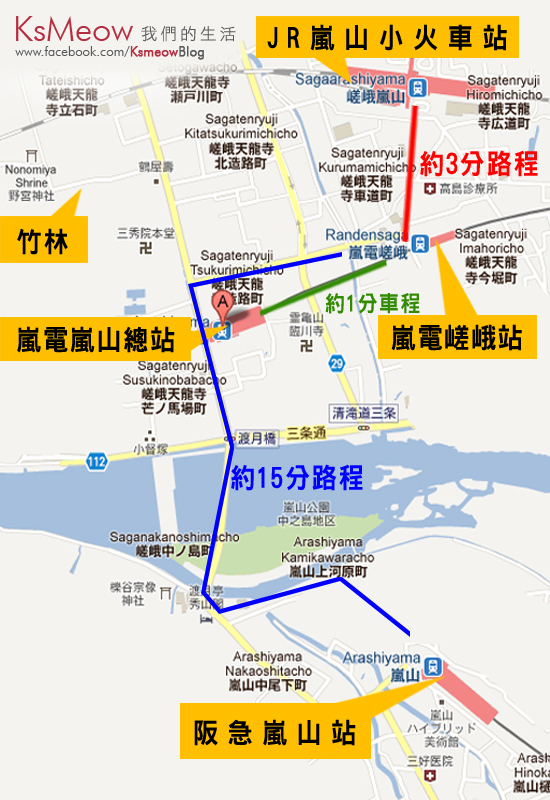 嵐山地圖,如想乘搭JR嵐山小火車可按地圖路線前往 |