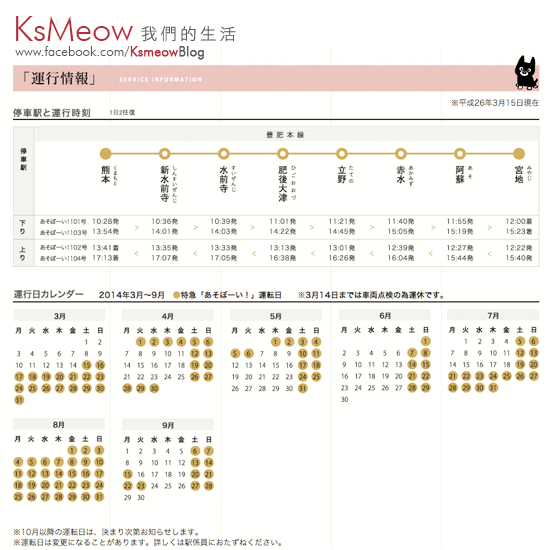 阿蘇男孩號あそぼーい!除了8月是天天提供服務外,其他月份也有特定出沒時間, 要是當天提供服務,亦只有4班! |