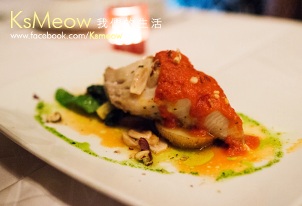 採慢煮的「欖油鮮鱈魚伴烤蕃茄香草」魚肉滑嫩具彈性,
